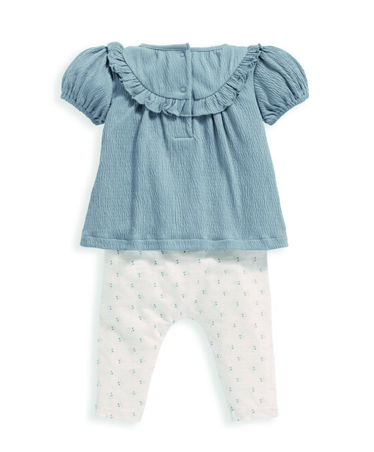 3-piece set includes T-shirt, leggings and matching knotted hat, for an easy instant outfit! Easy to get on and off, thanks to back neck poppers on t-shirt and elasticated arm holes, and elasticated waistband on leggings. Hat and leggings feature matching floral print!