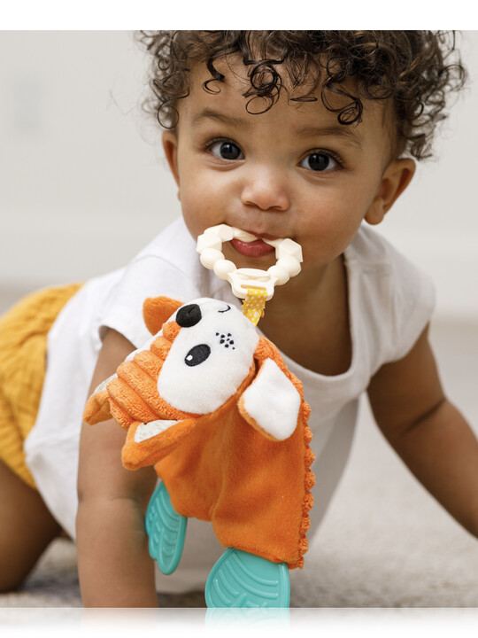 This snuggly teether toy features unique textures and crinkle sounds baby will love exploring. Babies are drawn to the bold colors, playful prints and soft fabrics. Features three BPA-teethers textured teethers for nibbling.