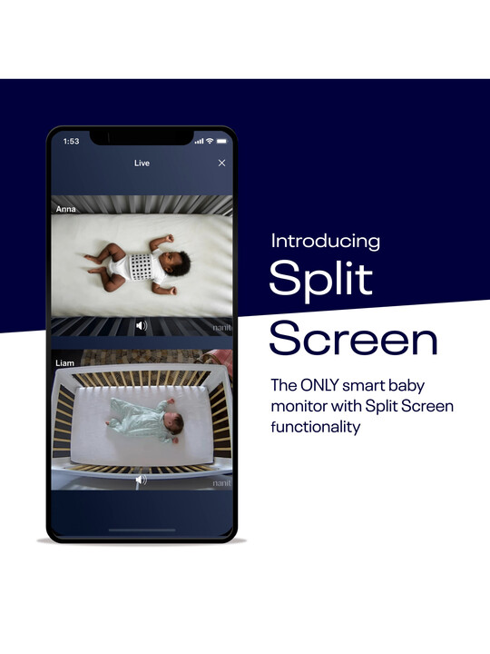• The only smart monitor with a Split Screen feature that allows users to see + control two cameras simultaneously in app